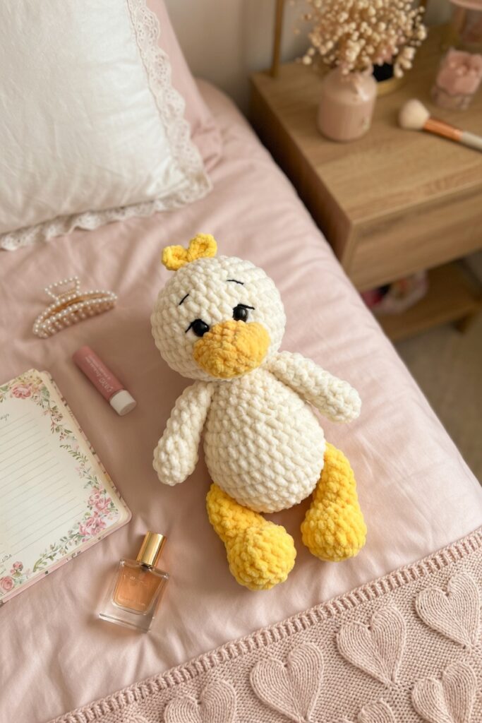 If you’ve been looking for your next crochet project that’s equal parts fun and adorable, meet this chubby little plush duckling. With her oversized beak, rosy feet, and fluffy topknot, she’s impossible not to love. This pattern is worked entirely in the round using soft chenille yarn and a 4 mm hook, making it approachable for intermediate beginners and satisfying for seasoned makers alike.